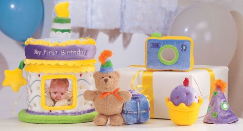 Description : Gund My First Birthday Playset Whether your baby knows it or not, the Gund My First Birthday Playset is the gift they want this year. Your child's soft, confetti-colored birthday cake holds a 2 x 2 photo with their cute little face. Out of the self-storing, zippered cake pops out a tiny teddy bear that plays "Happy Birthday." The plush party hat and present crinkle, while the cupcake rattles. All that plus a squeaking camera with unbreakable mirror make this set a terrific sensory development toy. Order the Gund My First Birthday Playset today!