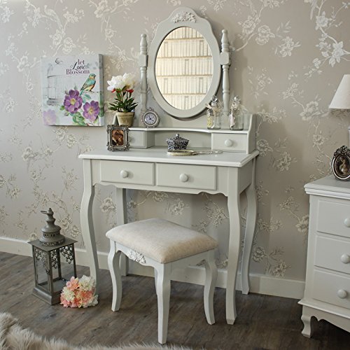Description : Grey Dressing Table, Mirror and Stool - Claudette Range A beautiful dressing table, large swing mirror and stool setPerfect for a girly bedroom with more items available in this range, the mirror has 2 small trinket drawers and 2 drawers on the dressing table and soft padded stool