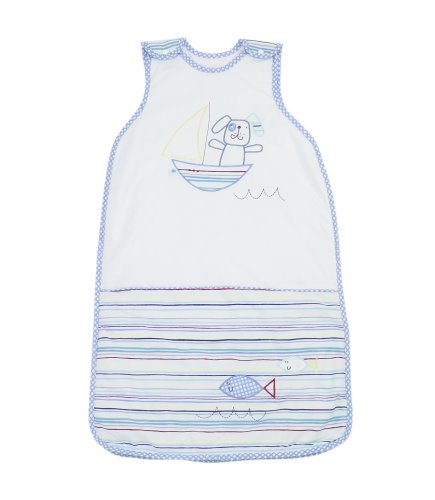 Description : Lollipop Lane sleeping bags are a safe and practical garment designed to ensure baby sleeps soundly and comfortably all night long. Lollipop Lane sleeping bags are suitable for babies from 3.5 kg (7 lbs 7ozs).The Fish and Chips bedding range from Lollipop Lane features Chips the puppy who loves to play in his sailing boat, bobbing up and down on the blue waves. Little Fish gather around his boat to join in the splashy fun. Lollipop lane Fish and Chips has a soft baby blue colour with embroidery in blue stitching with yellow accent embroidery. Exact designs may vary per piece. Exact designs vary per piece.